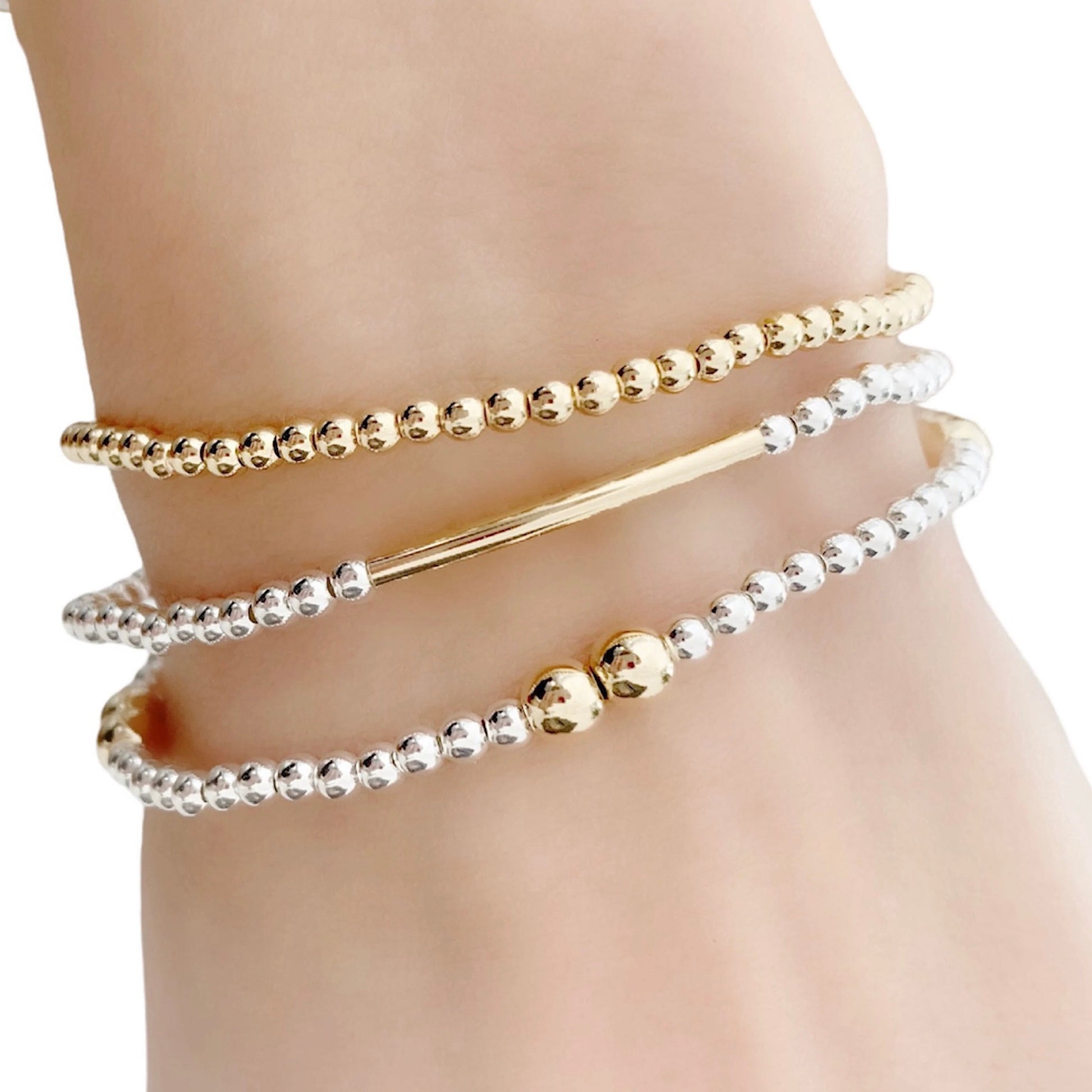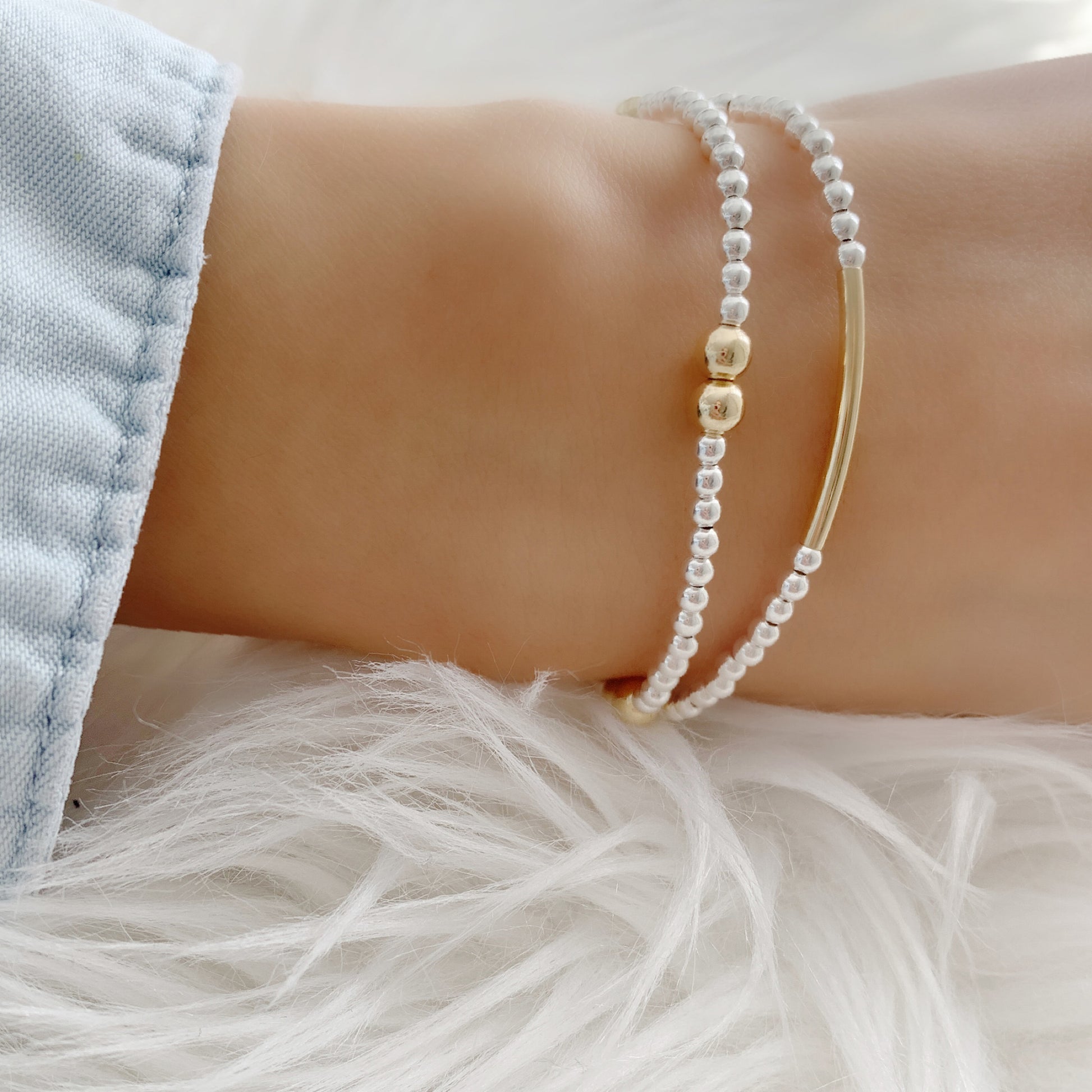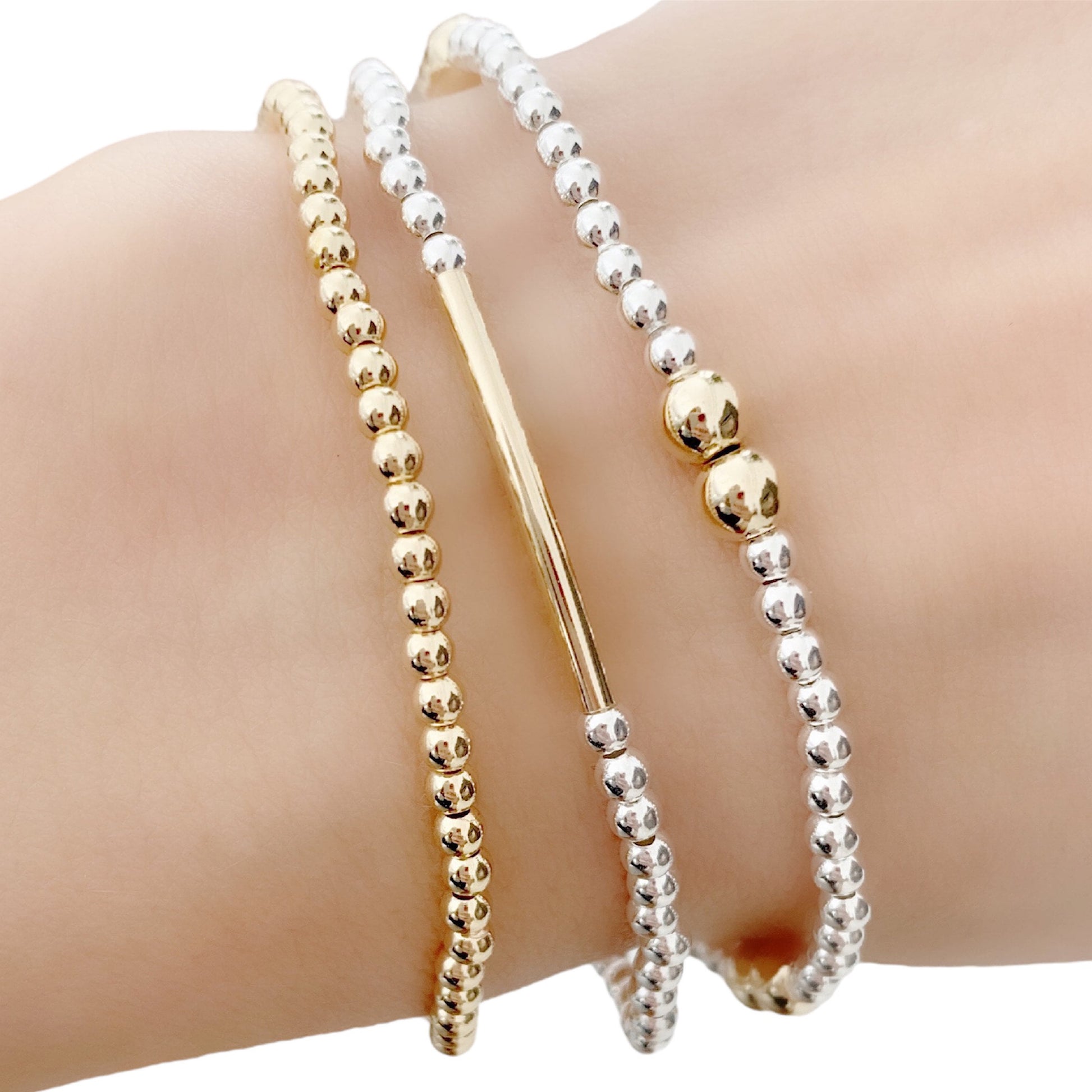 Dainty Gold stretch bracelet. Made with Sterling silver and 14k gold filled 3mm and 5mm beads or a gold bar Great to wear alone or layered with other beaded bracelets. Bracelet measuring about 7 inches . Made on Stretch cord. Please contact for custom sizing.