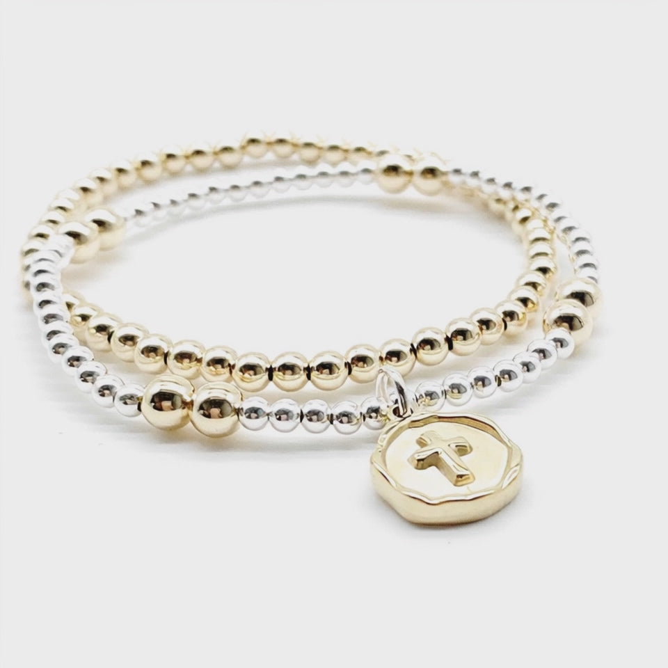 Dainty gold filled bracelet with cross charm a minimalist layering bracelet crafted with 14k gold filled 3mm beads and 5mm. This delicate cross bracelet is the perfect religious gift, baptism bracelet, confirmation gift, or bridesmaid jewelry. It can be worn alone or paired with other beaded bracelets for a layered look, and measures approximately 7 inches in length on a durable Stretch cord. Additionally, the included Cross charm is made from pvd Gold over stainless steel. Contact us for custom sizing options.