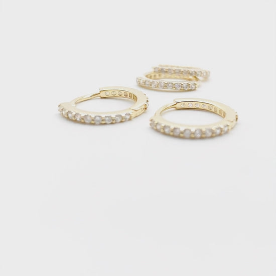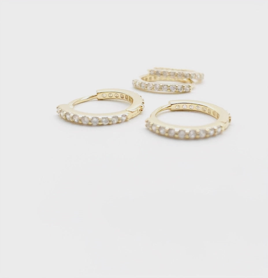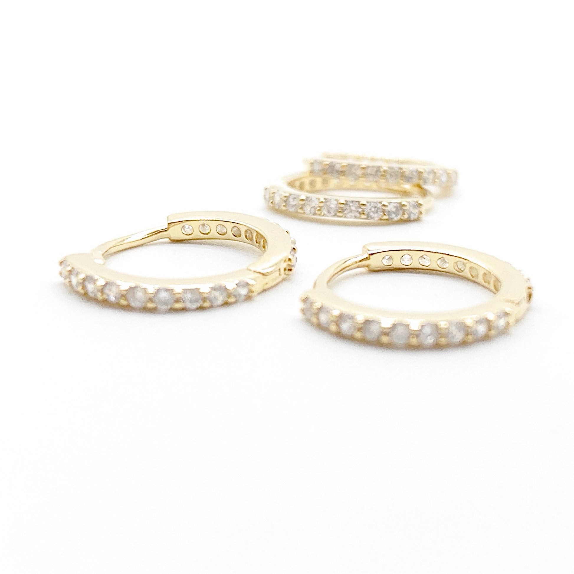 Experience the luxurious elegance of these 14k Gold over sterling silver Dainty crystal Hoops! These minimalist earrings, measuring at 11mm and lightweight, add the perfect touch to any outfit. Prefect Wedding Earrings for you or your bridesmaids