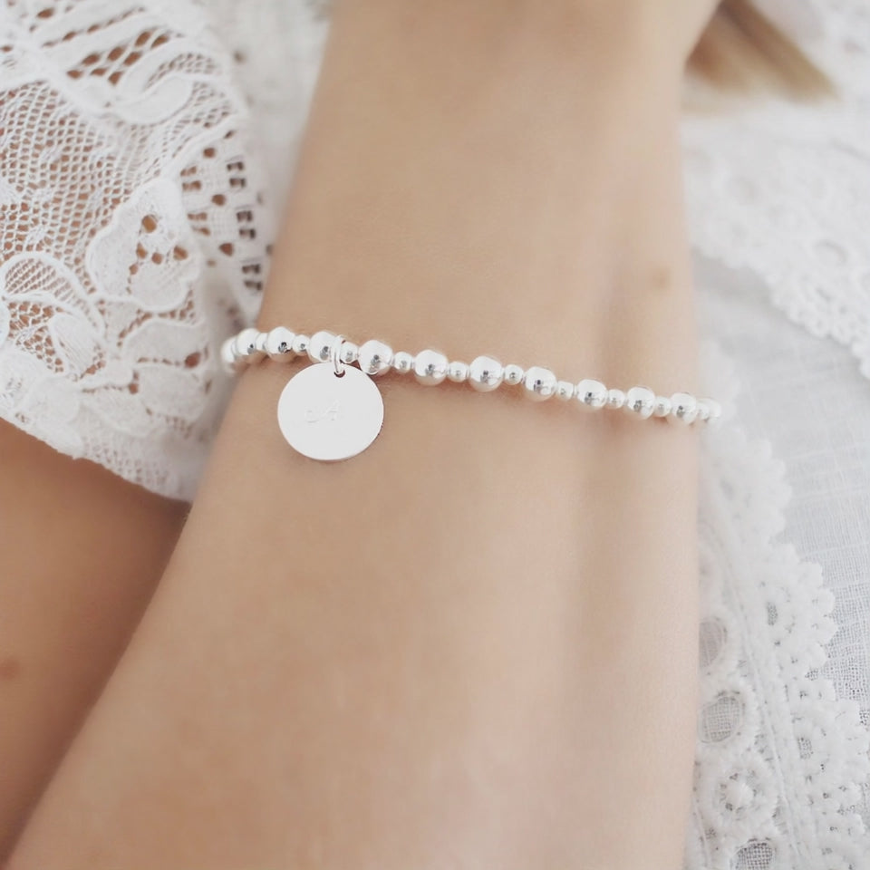 Sterling silver stretch personalized bracelet beaded with 3mm and 5mm Sterling silver beads. Great to wear alone or layered with other beaded bracelets. This stretch bracelet measures about 7 inches. Please contact me if you would like a custom size.